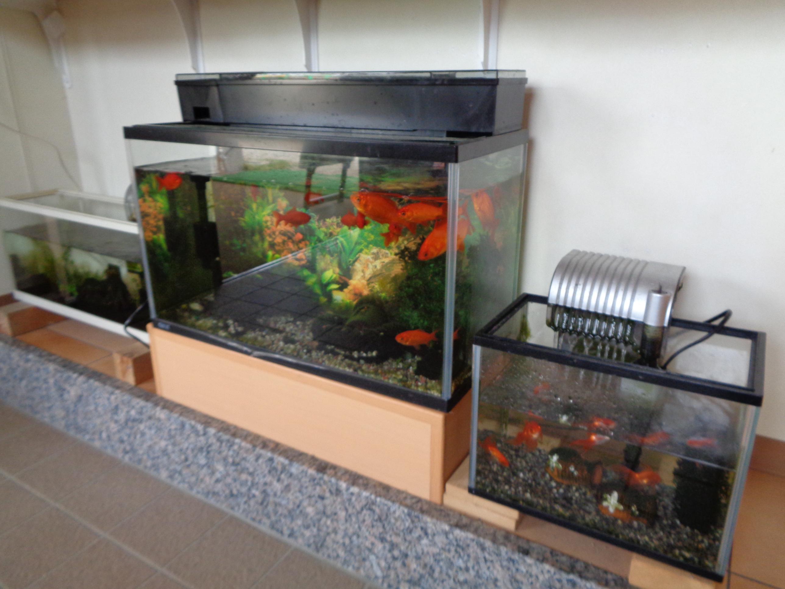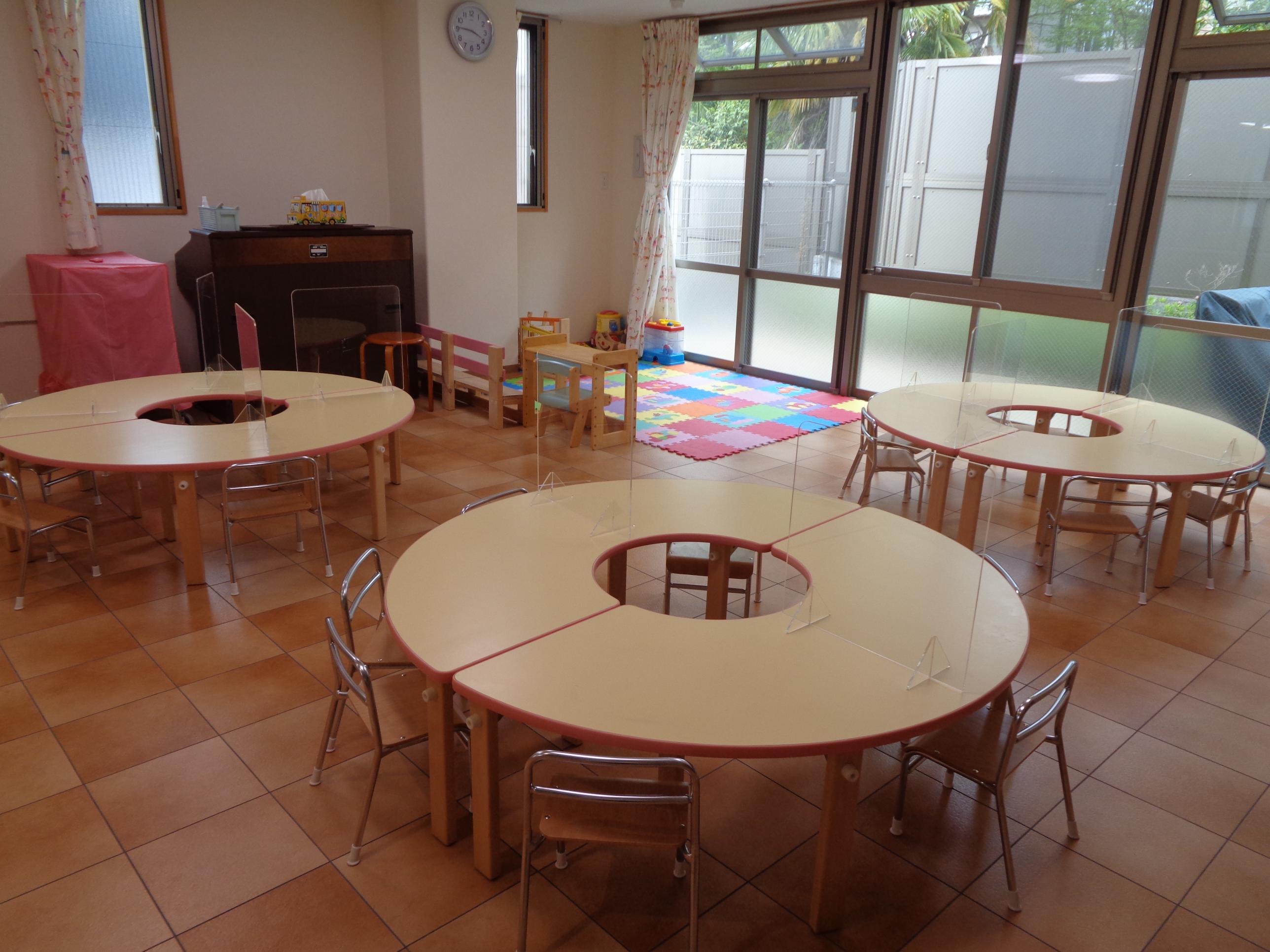 ![]() 事務所入り口には金魚の水槽があります。大きい金魚や小さいえびは、子どもたちに人気です。園庭のかめに住んでいるメダカを毎日覗き込んでいる子どももいますよ。  | |