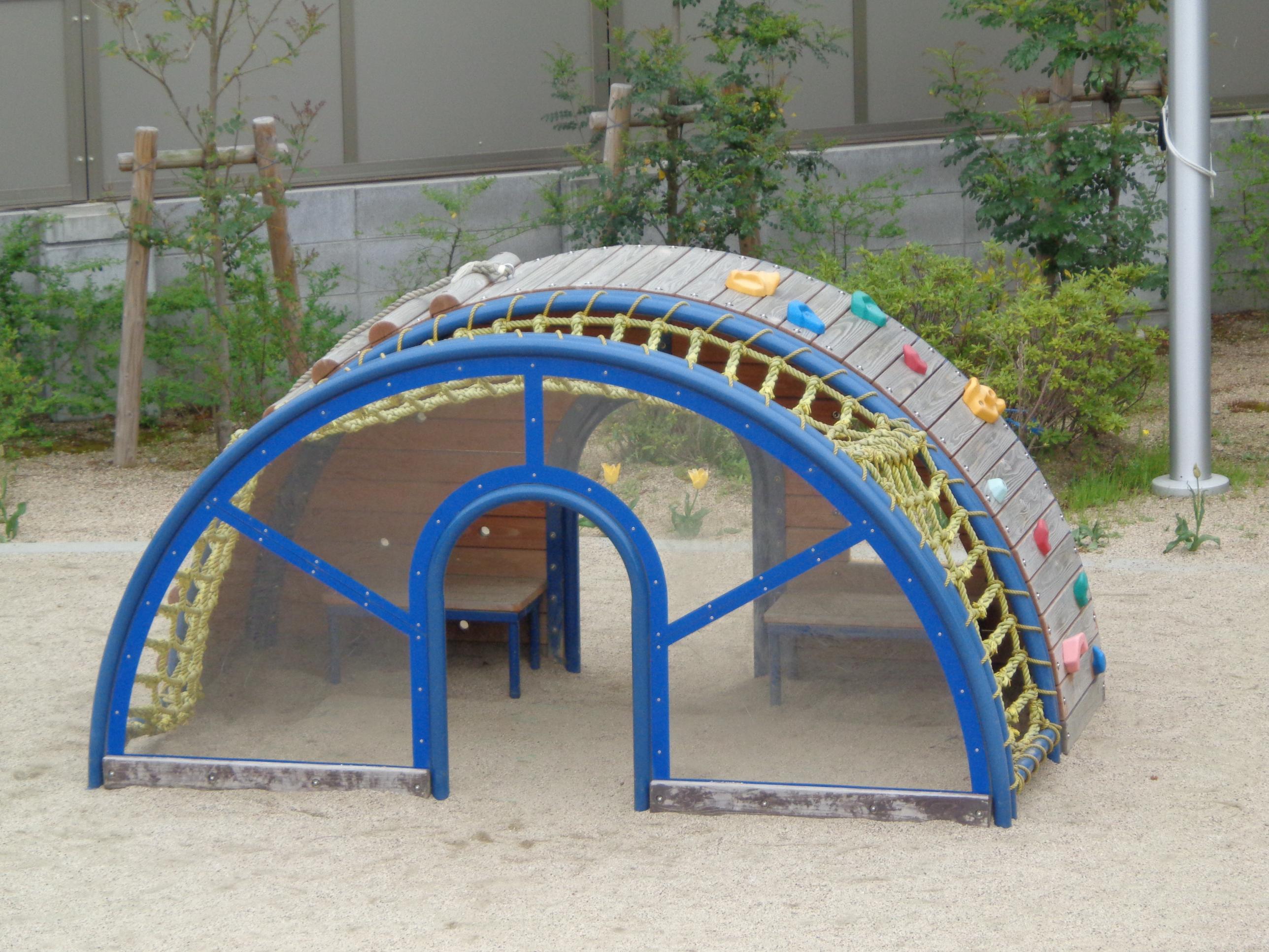 ![]() こちらは0,1,2歳児が大好きな遊具です。トンネルに隠れたり、ロープの網を渡ったりして楽しんでいます。  | |