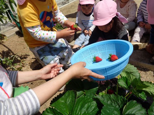 ![]() 園庭の一角にいちご畑があります。春になると甘い苺がたくさん実ります。その隣には小さな菜園があり、各クラス、季節ごとに色々な野菜を植えます。収穫を心待ちにしながら水やりや草抜きなどをします。  | |